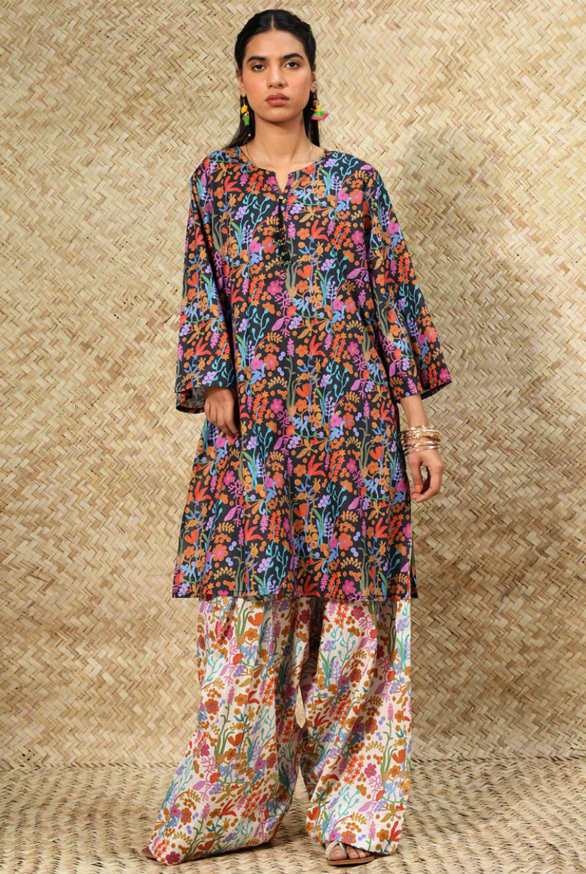 Printed classic-fit shirt adorned with playful tassel detailing along the V-slit. Paired with a coordinated printed farshi shalwar.